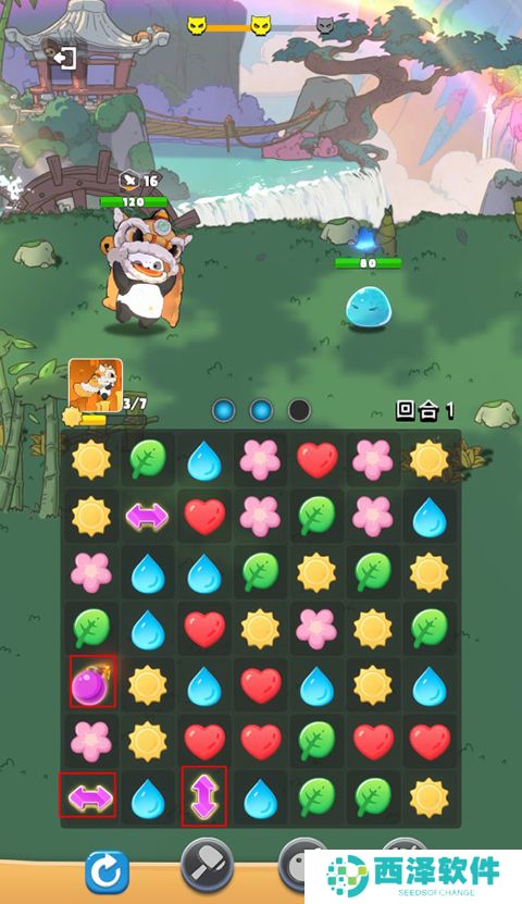 3、通过消除的方块会给小动物积攒攻击力,回合结束后会对敌人释放攻击。