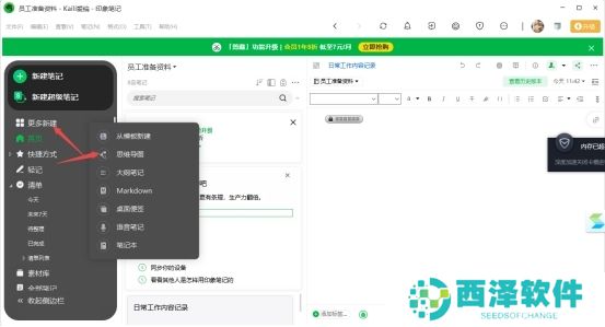 第一步,在电脑的桌面上,找到印象笔记软件,然后双击打开。进入到软件的主界面后,我们找到【更多新建】功能,并点击它,然后在弹出的选项中,选择【思维导图】功能。