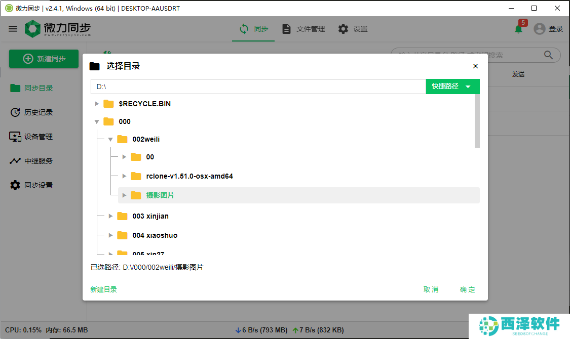 选择标准文件夹后将弹出“选择目录”对话框,选择要进行共享同步的文件夹。 创建目录时微力同步默认将选择的文件夹名作为此同步目录的名称,在创建成功后可通过选项设置修改目录名。 如下,选择了“摄影图片”文件夹保存后,将创建名称为“摄影图片”的同步目录,并显示在列表中: