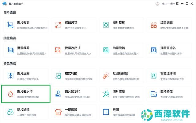 如果图片的背景较为复杂,我们可以使用图片编辑助手来去除水印,电脑找到并打开它之后我们选择图片去水印功能选择上传水印图片。