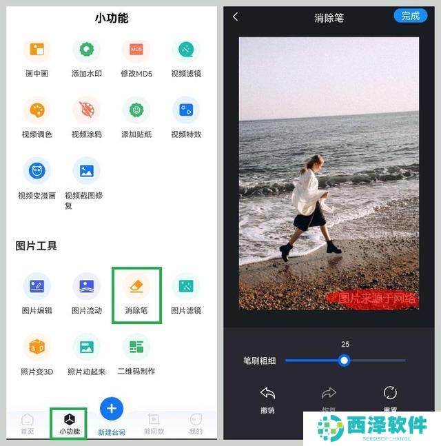打开之后我们在小功能中往下划找到「图片工具」中的「消除笔」工具,选择水印图片上传,涂抹水印区域,水印就成功被去除了。