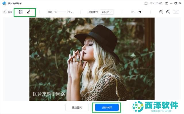 使用上方工具栏中的框选工具或画笔工具将图片上的水印选取出来,点击「去除水印」,水印就被去除了。