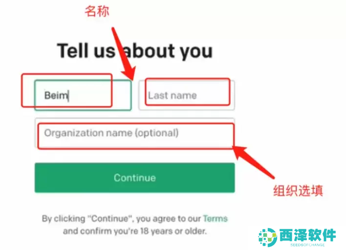 7、填写名和姓,下方的组织选填。