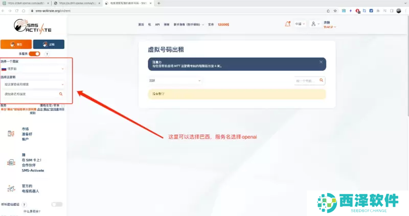 9、可以去租借虚拟号码,选择巴西,服务名选择[openai]。