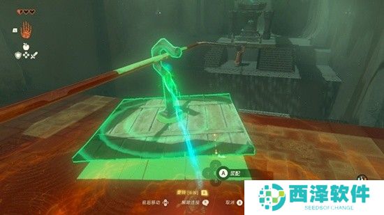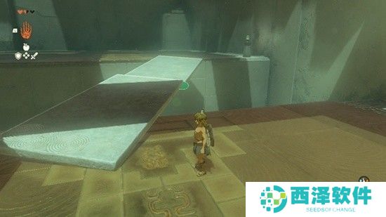 在前方的右上角顶部,有一个宝箱,使用长板子将其勾下来。继续往前走,发现一个类似索道的建筑,先取走左边的方形木板,然后将一个勾子形状的建筑放在木板的一边,固定好,再将另一个勾子放在另一边,粘住。使用究极手将木板挂上绳索,然后往前推一段距离,再拉上来。