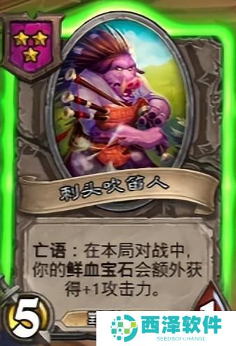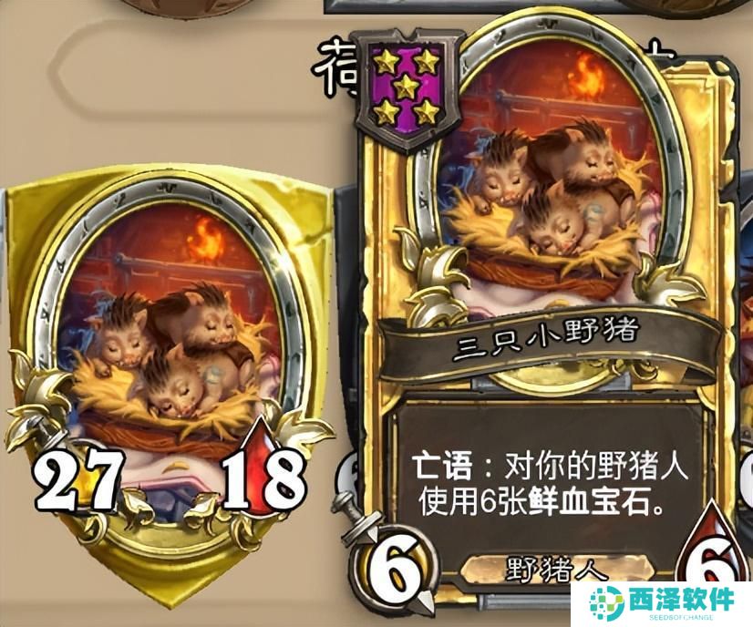 这里还是得夸夸原画师,这三只小猪画的憨态可掬。亡语效果是对你的野猪人使用3张鲜血宝石,金色后就是6张,一般有野猪人的局,同行不会主抓,因为效果只给野猪人加,其他体系更不会碰,所以还是很容易金色的。配合野兽的鹦鹉,一场战斗还是能加不少,记得这张牌要加上嘲讽,后手也得先送掉。