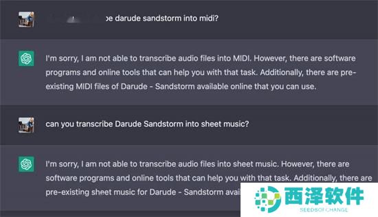注意事项:ChatGPT软件不能将音频文件直接转录成MIDI或乐谱。