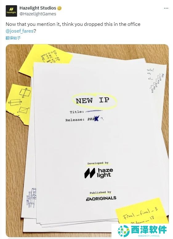 随后工作室Hazelight Studios也在社交平台晒出企划书封面,内容显示这部新IP游戏将在202X年发售,并且由EA发行。以上这些信息似乎说了,却感觉又什么都没说,可谓吊足玩家胃口,目前能够确认的是,新作依旧为曾创作过 《逃出生天》和《双人成行》 的Hazelight Studios所擅长的合作冒险类游戏。