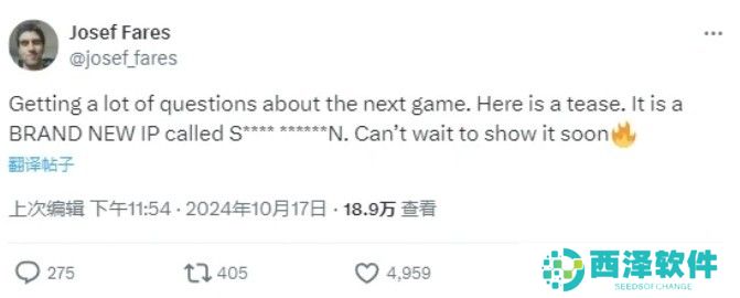 《双人成行》制作人Josef Fares及其工作室Hazelight Studios目前已经开始在社交平台上为新作进行预热。首先是Josef Fares在社交平台公布了新作的一些信息, 游戏是工作室的全新IP,被命名为《S **** ****** N》。