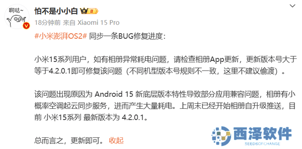 针对小米15系列用户反馈的相册异常耗电问题,小米官方也迅速作出回应。据透露,该问题主要由Android 15新底层版本特性引发的部分应用兼容问题所致。为解决这一问题,小米已经向用户推送了相册应用的更新,要求用户将相册App更新至4.2.0.1或更高版本以修复该耗电问题。