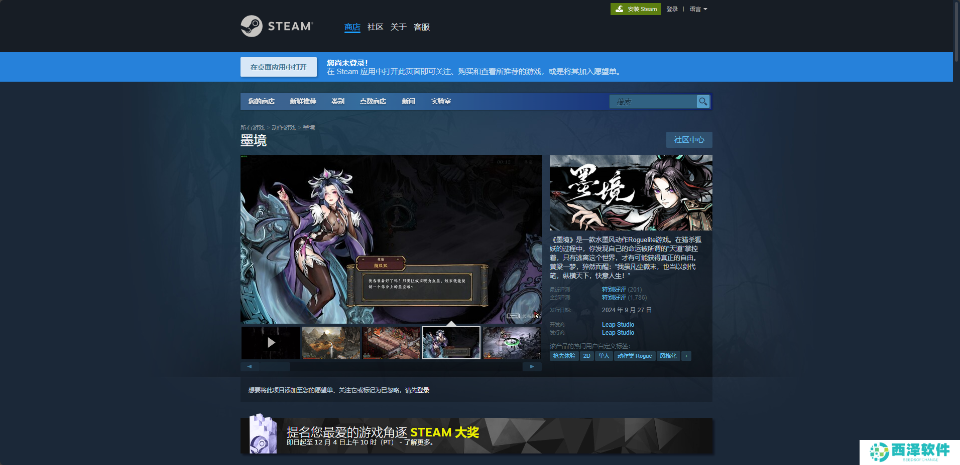 《墨境》是一款水墨风动作Roguelite游戏,而这款游戏的官网地址就是Steam平台的购买页面,进入到这个游戏的购买页面基本上就能知道所有这款游戏的信息。