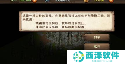 4、接着前往新场景的2,2这里,点击【刻字】后输入寒,这样石柱就会被一层淡淡的佛光所笼罩了。