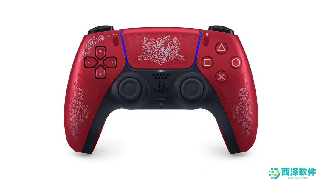 手柄以游戏中猎人首次使用的装备为灵感的精致设计,将火山红色的 DualSense 无线控制器两侧以银色浮雕呈现,触摸板上则印有禁足地调查队的徽章,手柄售价12480日元。
