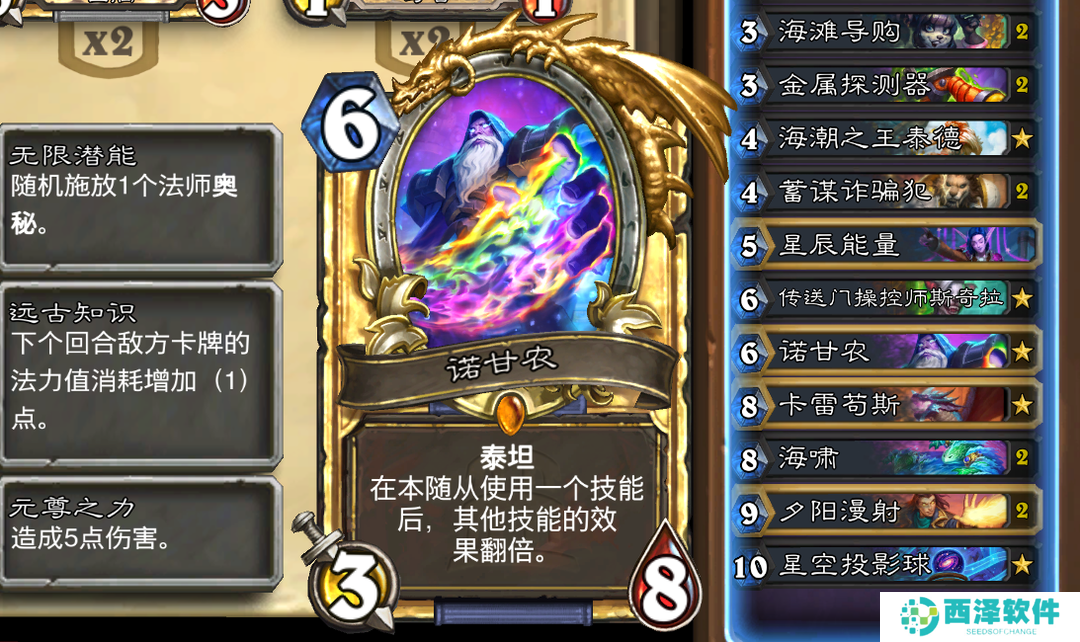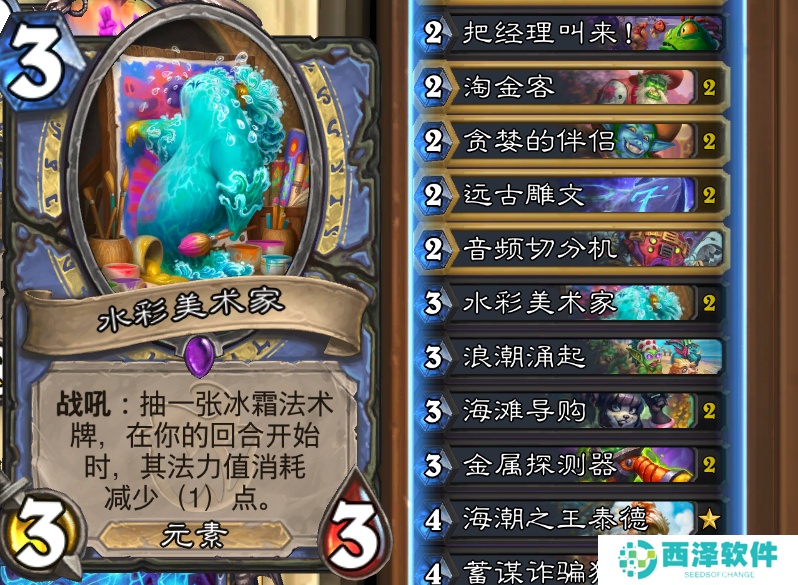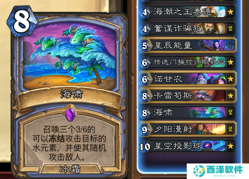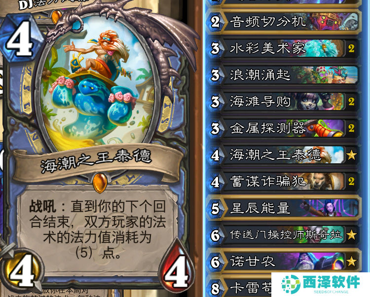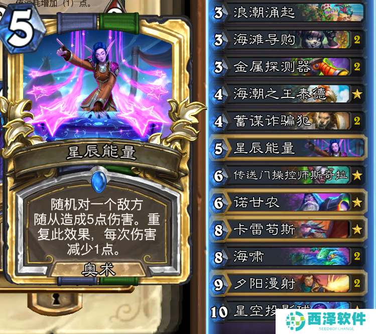 8费带了核心卡海啸,如今削减费用之后的海啸非常好用,三只水元素也不会挤掉随从,配合水彩美术家也能快速启动,这就是法师需要的,在小二看来这波完全是纯加强。夕阳漫射打10召唤10费随从,不仅能解场还能直伤斩杀,最后一张是法师后期兜底牌星空投射球,打慢速卡组记得音频切分机复制留给星空。
