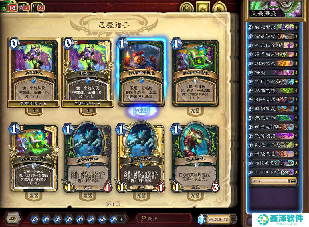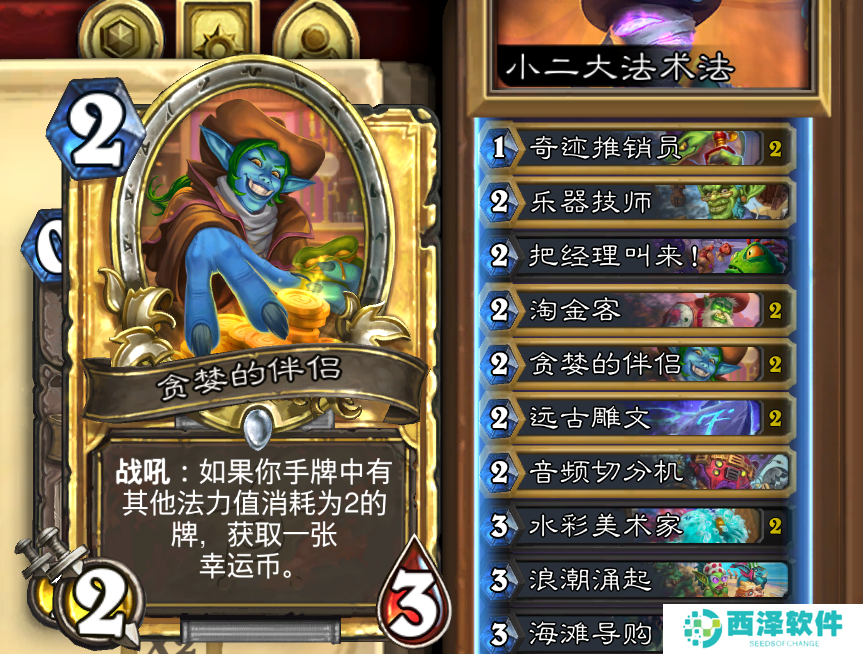 二费卡加的比较多,一共放了九张,分别是2张淘金客、2张贪婪的伴侣、2张远古雕文、1张音频切分机、1张乐器技师和一张把经理叫来,主要是保证前期站场,以及稳定触发贪婪的伴侣效果。