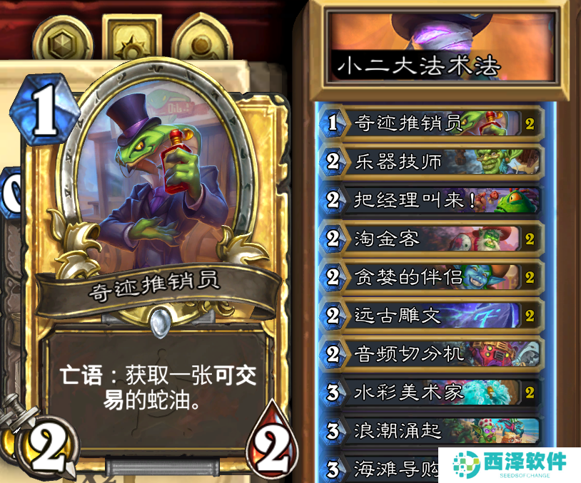 一费卡配备了两张奇迹推销员,在面对海盗瞎,元素萨这些快攻体系的时候,一费能战场压力会小很多,2/2的身材在前期相当能打,亡语给的蛇油也能作为过牌手段。