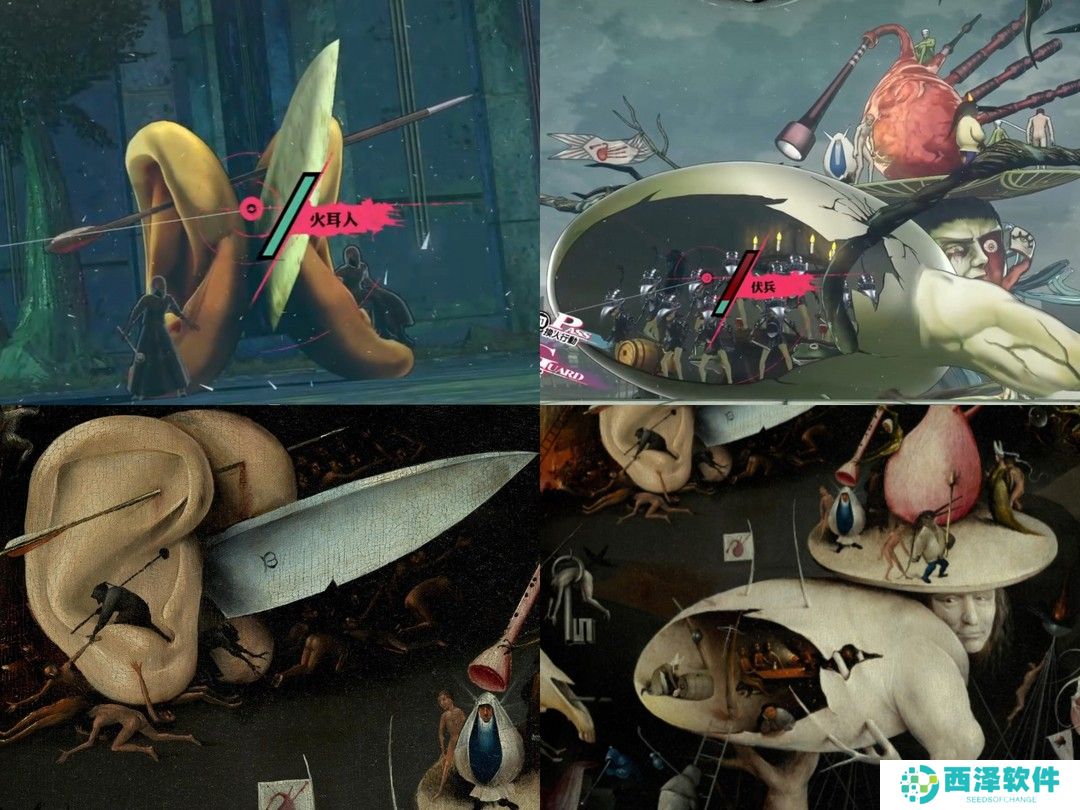 值得一提的是,部分人类Boss的设计参考了尼德兰画家耶罗尼米斯·博斯的油画《人间乐园》,这幅创作于500年的画用三联的形式分别描绘了伊甸园、人间乐园、地狱的场景。画作本身十分抽象荒诞,特别是右联的地狱呈现出一片混乱的景象,似乎在暗喻人类的七宗罪招致的恶果,游戏中的火耳人和贪婪之人Boss均出自这里,此外还有一些猫头鹰和鸟类敌人的形象也有参考借鉴,感兴趣的朋友可以看看关于这幅画的解读。