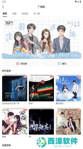 2、进入广播剧单元,这里有推荐、玩家、未完结、全一期等板块供用户选择