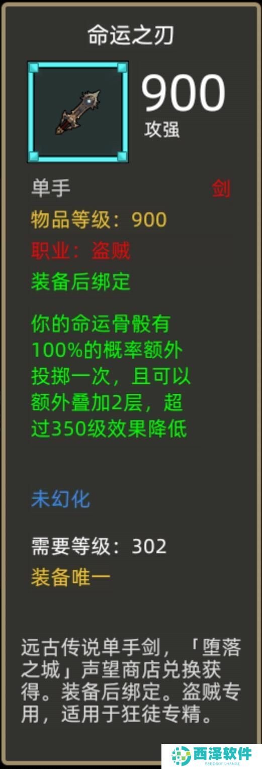 装备效果:你的命运骨骰有100%的概率额外投掷一次,且可以额外叠加2层,超过350级效果降低。