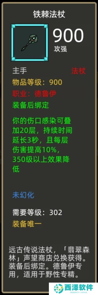 装备效果:你的伤口感染可叠加20层,持续时间延长3秒,且每层伤害提高10%,350级以上效果降低。