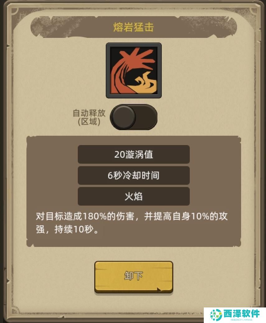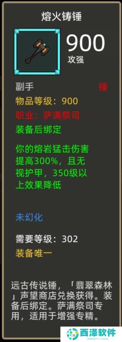 装备效果:你的熔岩猛击伤害提高300%,且无视护甲,350级以上效果降低。