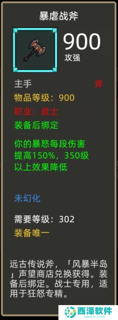 装备效果:你的暴怒每段伤害提高150%,350级以上效果降低。