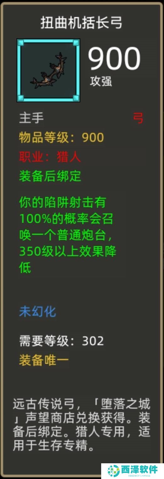 装备效果:你的陷阱射击有100%的概率会召唤一个普通炮台,350级以上效果降低。