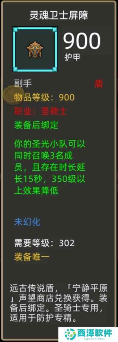 装备效果:你的圣光小队可以同时召唤3名成员,且存在时长延长15秒,350级以上效果降低。