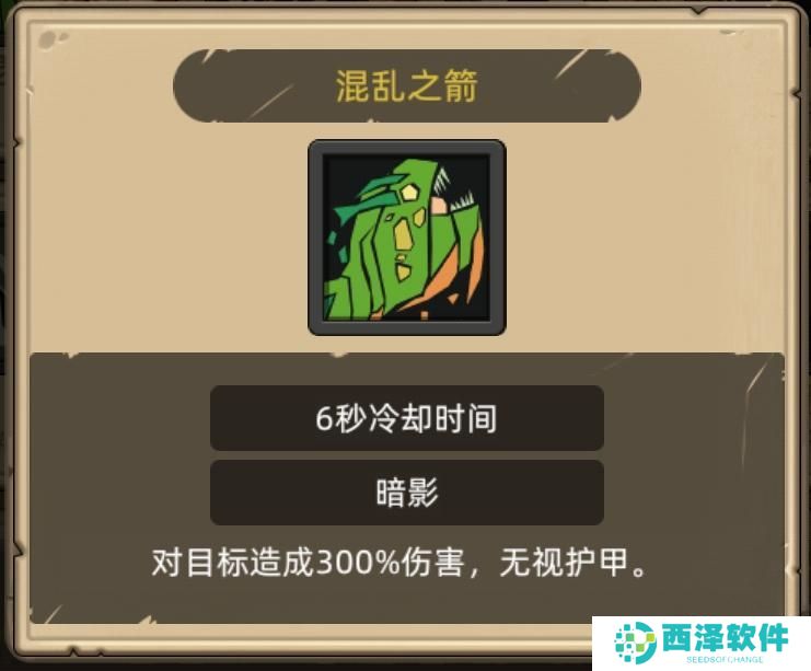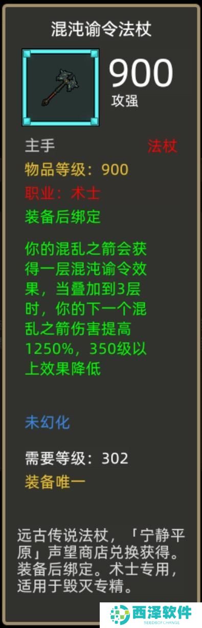装备效果:你的混乱之箭会获得一层混沌谕令效果,当叠加到3层时,你的下一个混乱之箭伤害提高1250%,350级以上效果降低。