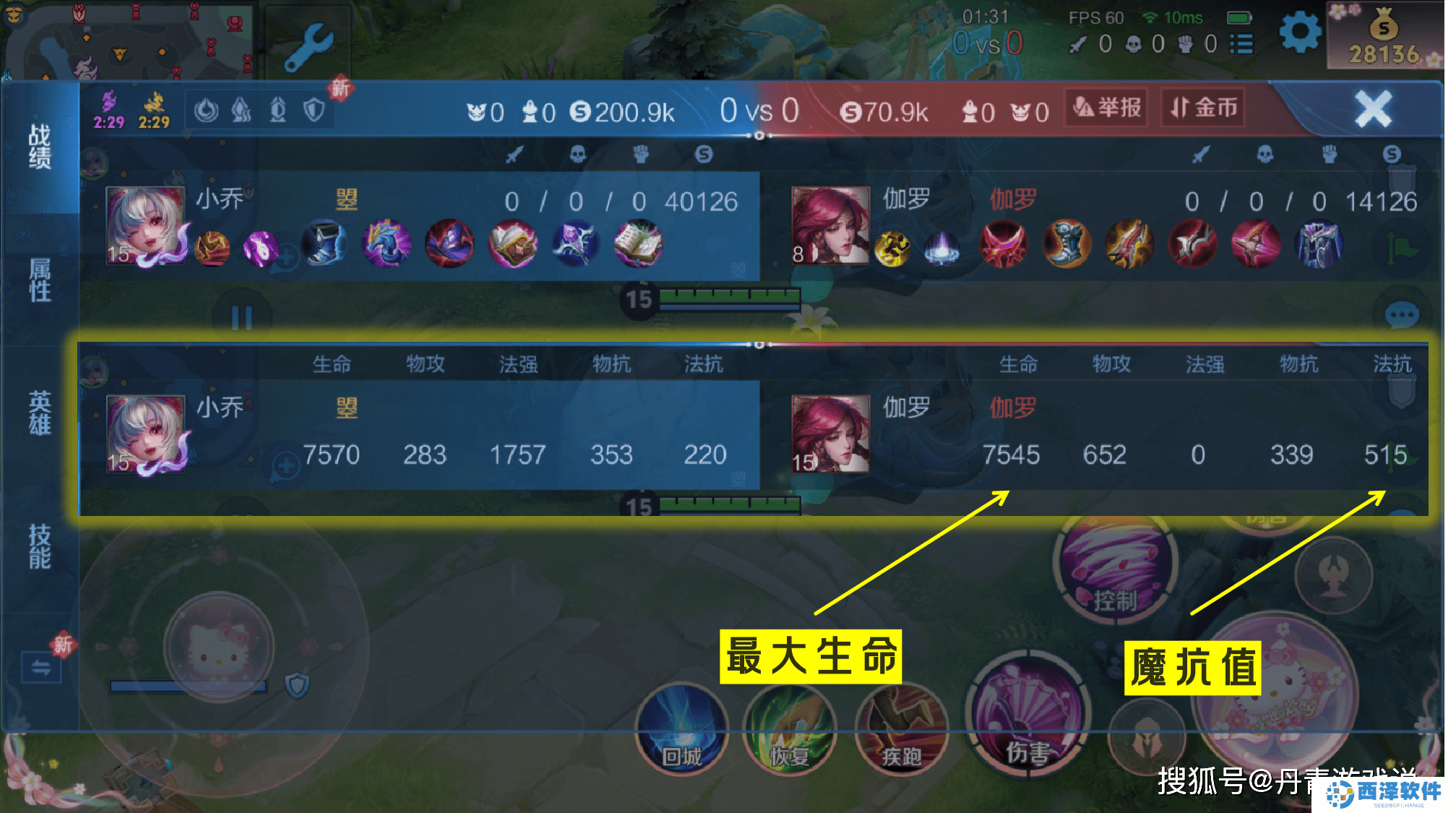 接下来,我们以满级六神装的伽罗为例,分析了她面对小乔时的生存能力。伽罗的出装和属性显示,她拥有7545点最大生命值和一定的魔法抗性。然而,当小乔攻击她时,伽罗的剩余魔法抗性被迅速削减,导致她无法有效抵挡小乔的高额伤害。