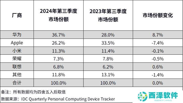 紧随其后的是苹果,但其市场份额在第三季度出现了同比下滑。尽管返校季促销活动对新款iPad Air和iPad Pro的销售有所提振,但面对国内品牌的竞争和自身产品高昂的价格,苹果的销售压力依然不减。