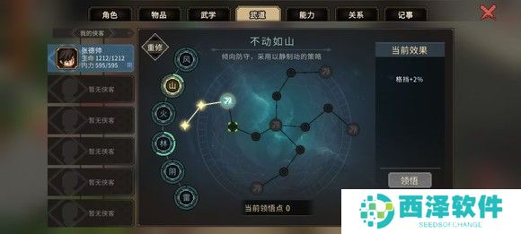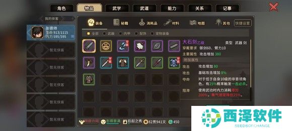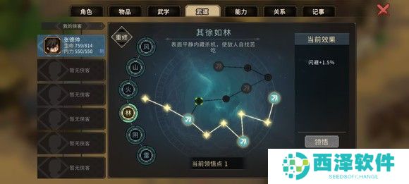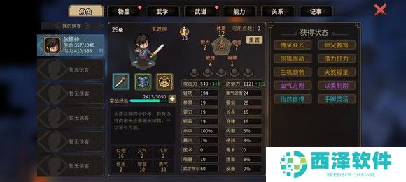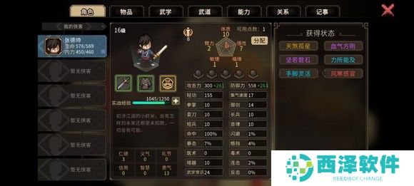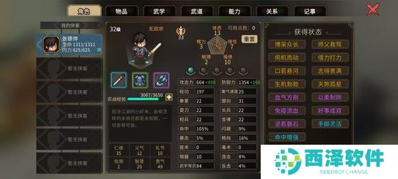 然后前往楚襄城衙门参加楚襄英雄会,这里有三个人比较难打独孤剑一,欧冶恒和穆再兴,最难的是欧冶恒,我的建议是遇到欧冶恒直接sl,剩下两个人靠卖血召唤师父完全顶得住。我运气比较好,打的时候这三个都没遇见。放一下面板图,只要遇不到欧冶恒基本就是稳的,武道再点山的减伤。胜利后选择扬名立万,便于刷好感度