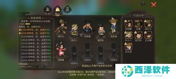 然后返回无名小村,把无名小村的人全拉到队里面(需要两个灵芝,开局迷踪林有两个,吃了的话就夜摩坊拍卖或者等家园后山等级高了在后山挖),然后放到后山让他们当黑奴挖矿(自己挖矿的时候记得带着他们升臂力),茶摊和江湖人好感拉高触发剧情获得藏宝图(触发剧情之前先学艺得机关经验)