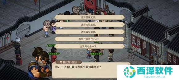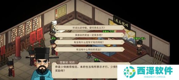 来到武馆门口触发剧情,选择代表自己出战,没什么难度,还不如海蛟帮难,都不用师傅出场。全部胜利后获得飞刀秘传,同时名声达到4级解锁家园,然后找武馆馆主完成楚襄英雄会报名。