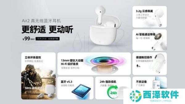 而Air2真无线蓝牙耳机则以小巧便携著称,单耳重量仅为3.2克。它同样搭载了13mm超大复合振膜,并结合AI通话降噪功能,为用户带来纯净的听觉享受。支持游戏模式低延迟至50ms的Air2,上市价定为99元。