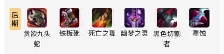 1、出装顺序:星蚀+黑切+幽梦+死亡之舞+铁板鞋+贪欲九头蛇