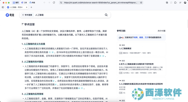 与传统的日常检索相比,学术搜索对信息的权威性、专业性和时效性有着更高的要求。夸克学术搜索通过大模型能力,每次回答都能引用10篇以上的文献内容,确保信息的准确性和全面性。这不仅满足了学术工作的严谨性需求,还为用户提供了**度的信息归纳和知识整理。