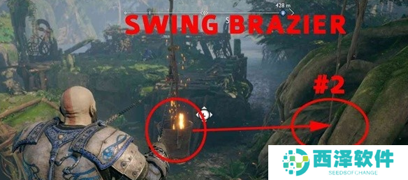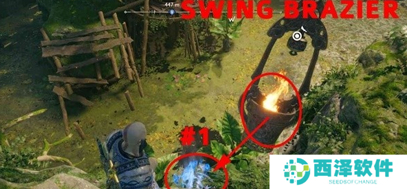 12、再让塔吊右转,拉着火盆往右边摆动点燃附近的第二个符文机关。
