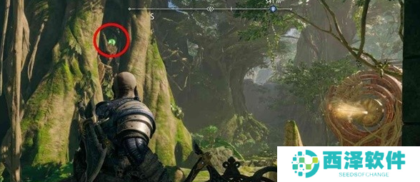 10、离开屋子返回之前荡的位置去木制码头的反方向走,用混沌之刃到大树上然后到墙上。