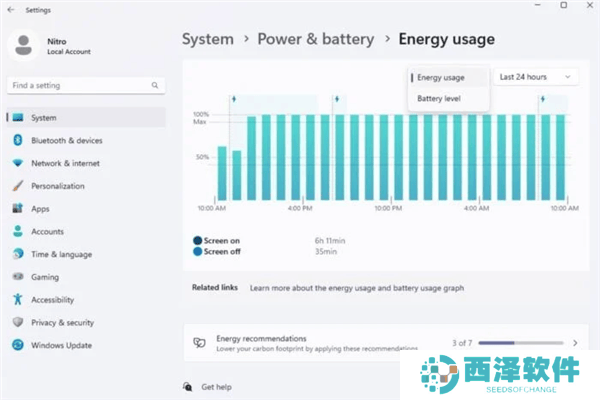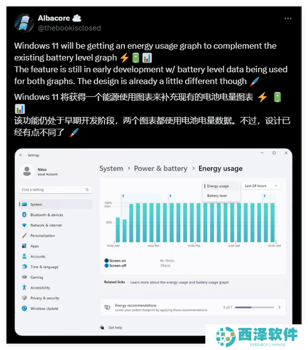 据悉,这项功能将在Windows 11的设置应用中新增一个专门的能耗图表,用户可以轻松地查看电脑在过去24小时内的能耗数据,从而更加清晰地了解自己的电脑能耗情况。